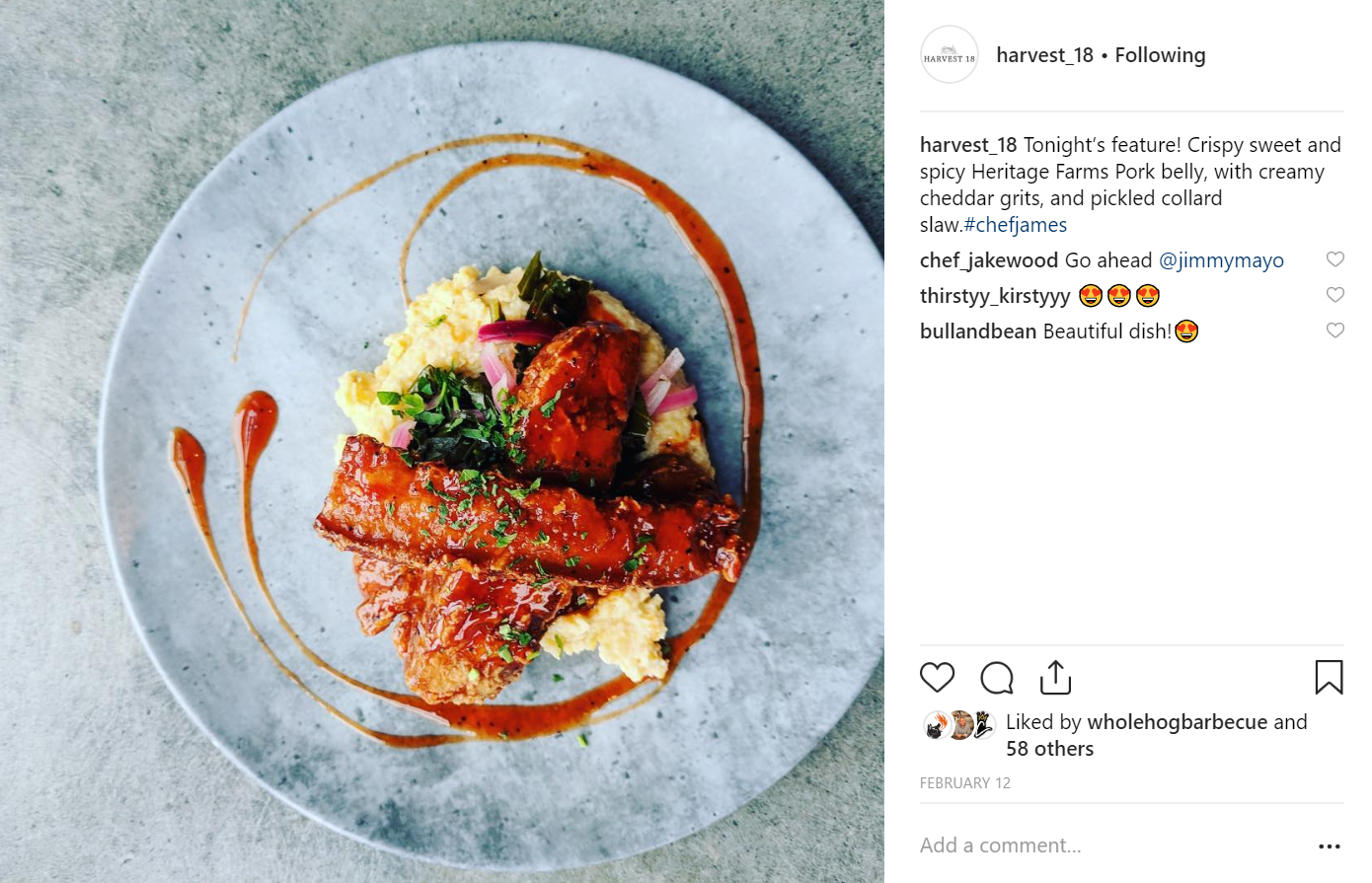 5. Some of our biggest supporters! We just love the fine folks at 18 Restaurant Group. One of their restaurants, Harvest 18, featured our pork in this delicious feature: Crispy Sweet and Spicy Heritage Farms Cheshire Pork Belly with Creamy Cheddar Grits and Pickled Collard.