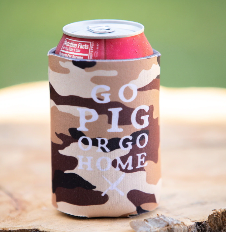Keep your drinks cold in style with the Heritage Farms Cheshire Pork "Go Pig or Go Home" Brown Camo Koozie. ($5.99)